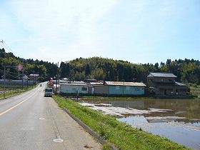 | (以前の記述) 大蔵館は、大蔵城の東北500m、水田地帯に面した比高10mほどの低い台地上にあった。下の道から上がっていくと、切り通しのような道で、その脇は土塁状になっており、虎口のようにみえる。 台地の先端部は、ゲートボール場になっており、改変されているが、この辺が館の跡であろうか。さらに台地を上がっていくと、やはり虎口状のものがあり、その先は山林と畑になっている。歴史等詳細はやはり不明。すぐ北側に金尾城がそびえているのがよく見える。 |
