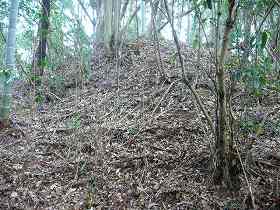| 台地先端部にある土壇。櫓台というほどの規模はなく、古墳ででもあろうか。 | Bの虎口。明らかに虎口のように見えるのだが、ここに通じる道はなく、下は急斜面となっている。 |