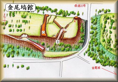 県道112号線が北上して県道22号線に突き当たっている信号があるが、その南西一帯が比高20mあまりの台地になっている。この台地はかなり広大で、北側部分は特に東西に長く延びているのだが、台地東南の先端部分はかなり細長くなっており、そこが金尾城の跡となっている。(下の以前の記述で述べているのはこの台地の北側付近で、こちらは広いだけで遺構らしきものは存在していない。)