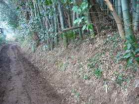 | 西側の土塁。郭外からの高さは2mほどだが、郭内からは3m余りあり、郭内の方が低くなっている。 | 北側の土塁は道路に少し削られているように見える。 |