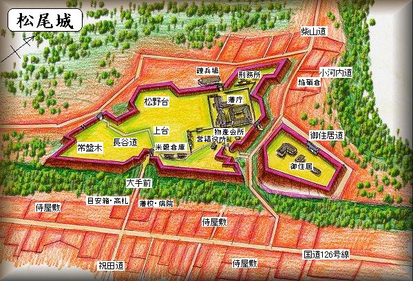 松尾城は松尾町役場の北500mほどの所にあり、御住居跡が松尾中学校に、藩庁が町営の自動車教習所となっている。比高20mほどの台地南端部を利用した城郭であった。