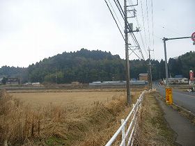 | 北側から見た小川城。比高20mほどの台地上にある。 | 北側に集会所、寺院、神社などのある所がある。(いずれも昭文社の地図には載っていなかった。) この神社の背後から藪の中を直登山していった。ところで、「房総の古城址めぐり」に「城内には妙見社がある」としているのは、これのことであろうか。 |