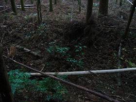 また、堀切3は、堀切ではなく、ただの自然地形であるかもしれない。堀切2や3の北側は、土地がだいぶ崩落した形跡が見られるので、本来の地形とだいぶ変わってしまっているようにも見える。ひとまず、直線連郭式の小規模な砦とみてよいであろうか。小規模とはいえ5つの砦群の中では、もっともそれらしい遺構を残しているといえる。