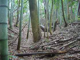 | 堀切から1郭の城塁を見上げた所。高さ3mほどである。この堀切は深さはそうでもないが、幅は10m近くある。 | 2郭と台地基部との間にある堀切部分を2郭側から見た所。堀底にも墓地がある。 |