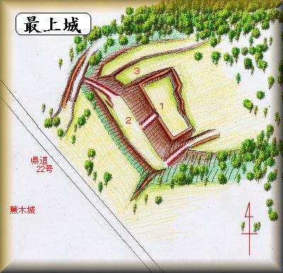 最上城は、県道22号線の「みの輪」というバス停のすぐ北東側にある比高20mほどの台地先端部にあった。城内は山林化しているため状況はつかみにくいが、先端近くには充実した遺構をみることができる。県道をはさんですぐ西側には蕪木城があった。