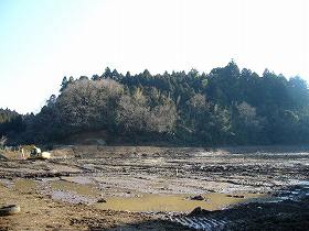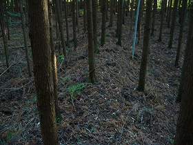 | すでに夕方で薄暗い。城内に残る土塁。高さ2mほどである。 | 南北に延びる土塁。 |