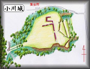 「昭文社」の地図を見ると、小川地区に「御城内」という字(あざ)があるのが見える。この「御城内」という文字が載っている部分がまさに城址ということになる。城は比高20mほどの台地である。西側が台地基部に当たるが、かなり細くなった部分でのみ接続しているので、かなり独立性は高い台地であるといえる。