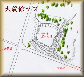 大蔵館は、西徳寺の東100m、大蔵神社の北200mほどの所にある。比高10mほどの低い台地の先端部分である。北側から台地にあがっていく道が見えており、ここを進むと、切り通しの道路によって区画された50m四方ほどの空間があり、現在はゲートボール場になっている。この辺りが館跡、ということになろうか。すぐ北側には金尾城が見えている。