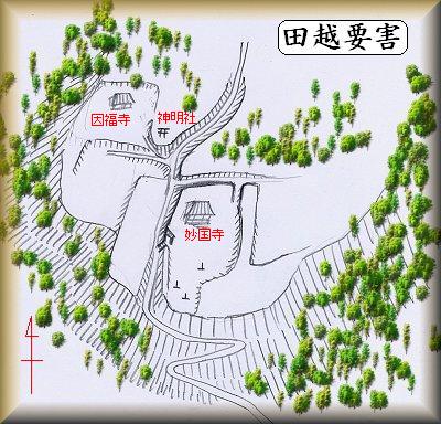 旧松尾町と成東町との境界近くの田越(たごせ)の比高20mほどの台地先端近くに妙国寺という寺院があるが、この辺りを「要害」と呼んでいるという。「要害」という地名が残っているからには、城址であることにはほぼ間違いないと思われる。