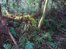 台地の斜面はそれほど急峻でもなく、東側辺りから登りやすそうに見えるのであるが、こちら側にはけっこう家が建て込んでいる。仕方がないので、台地北側下にある集会所、寺院の奥の神社の辺りから直登する事にしてみた。そんなに急峻ではないので登るのが大変ではなかったが、藪がけっこうひどい。