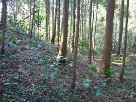周囲もみな急峻でしかもヤブであり、登るのは大変そうだと以前は思っていたのだが、よくよく見てみると、西側の斜面に山道が見えている。ここを上がっていくと、堀切底の3の部分と2郭とに墓地があることが分かった。そのために山道が造られているのである。そのおかげでわりと楽に登ることができた。この道がなければ登るのはとても難しいであろう。