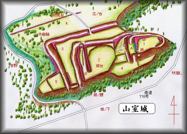 さて、おおまかに山室城を見てきた。この城は従来から「飯櫃城に移る前の山室氏の居城」といわれている。「山室」という名称からしてもそれは間違いないと思われるのだが、現在残る遺構を見ていると、単に山室氏の古い時代の城というよりも、山室氏が飯櫃城を築いてそちらに移ってしまった後も、山室氏かあるいは別の勢力によって拡張、使用され続けた城であったと思われる。