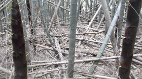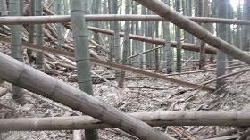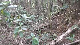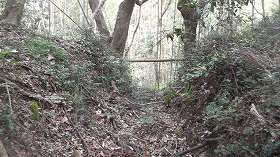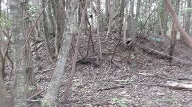 | 南西にあった郭に開けられたタコツボであるが、倒竹がひどすぎて、なんだかよく分からない。 | 主郭北側下の横堀とされている部分。倒竹がひどすぎるということもあるが、私にはただの帯曲輪にしか見えなかった。 |