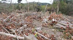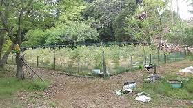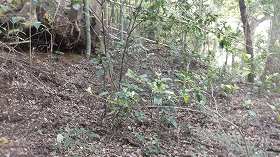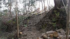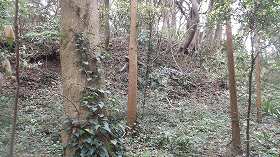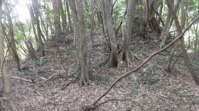 | 5の郭。木が切り払われていた。 | 2郭と3郭との間の横堀。折れが見られる部分なのだが、ヤブで分かりにくい。 |