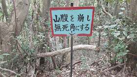 | 登ってすぐの所にある1の郭の標柱。この後、郭表示が続いていくが、郭の間に区画性はほとんど認められない。 | 切岸の解説であるが、これでいいのだろうか。 |