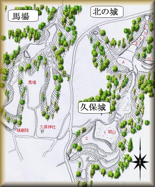 もう1つ、城郭に関連するのではないかと思われる個所がすぐ近くにある。道路を挟んで西側の、久保神社背後の谷戸状部分である。ここは民家の敷地内のようで、内部探索はしていないが、航空写真を見た所、この谷戸部の両側には、畑地として整備されている尾根が長く入り込んできていて、谷戸内部を東・北・西から守る城壁のような構造となっている。つまり、この内部は谷戸式居館を営むのに絶好の場所なのである。この内部には「馬場」という小字名が残っている。馬場は城館跡によく見られる地名であるから、その点からも城館跡らしき匂いがする。古い時代の居館であれば、このような谷戸内部に営まれるのはごく自然なことである。久保氏の初期のころの居館がここにあった可能性は、かなり高いのではないかと思われる。