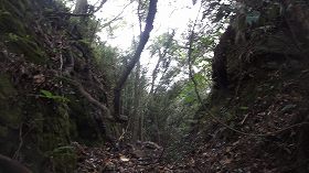 | 山上に出る切り通し道。これが岩盤堀切だとしたらすごい遺構なのになあ。薩摩の清色城のミニチュア版みたいである。 | 山上はかなり広いが、傾斜地形であり、とても建造物は建てられそうにない。 |