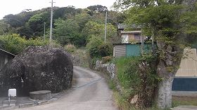 | 南方から見たとうしろ台。ほとんど自然地形の地山である。 | とうしろ台への登り口。右手に井戸があり、左側に大岩があるのですぐに分かる。この道をまっすぐ山の方に登って行けば5分で到達できる。 |