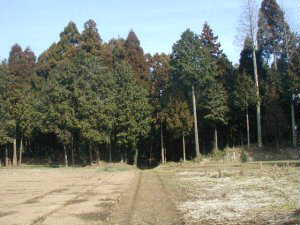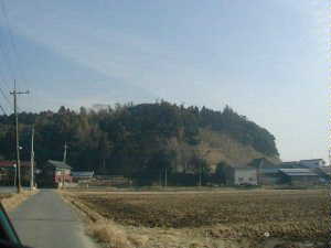 | 分かりにくい写真だが、1郭東北部の土塁を、二重堀の間の土塁上から見たところである。この角の部分は東北に張り出していて、櫓台のように見える。堀もこの辺りでは幅が広くなっている。 | 1郭内部の様子。南端辺りから北側の(あ)虎口を見たところ。右側の土塁が見える。右側は土塁が郭内からも高く、1.5m〜2m以上はある。虎口の左側には、木の陰になっているが、やはり土塁が延びているのがわかる(分からないかな・・・)。1郭の規模は歩測によると東西100m、南北126mほどである。 1郭は北と東側はかなり防備が強力であるが、西と南はあまり造作がない。西にわずかな高さの土塁、南にちょっとした段差があるくらいである。もしかすると外周部は崩落してしまったのかもしれない。 さて、1郭北の左側の堀についてだが、外側の堀はかなり浅くなっており、しかも途中で切れている。また、この堀のさらに北側にも、もっと浅くなっているが、堀の痕跡が見られる。土橋のような部分もある。ここはもしかすると、3重の堀と土塁があったのかもしれない。耕地整理をする際に、この部分がかなりいじられている可能性があると思う。 しかし、地元の人に聞いたところでは、「さあ・・・」というばかりであった。埋められたとすれば、そうとう古い時代の話のようだ。 |