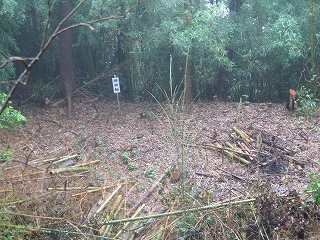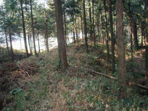 | 枡形虎口下の腰曲輪。腰曲輪までは高さ10mほどの垂直切岸となっている。 | 標柱の所から、北東の櫓台を見たところ。草刈りをしてくださったおかげで形状がしっかり分かる。 |