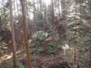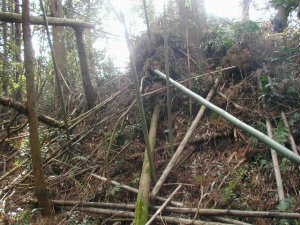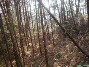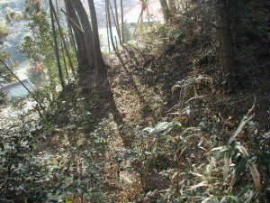 | 外郭線は北側で、幅30mほどの(き)の空間で分断されている。ここに外郭遺構が存在していたのではないかと思う。(き)の辺りは、右側の道の辺りでは郭内側で2mほどの高さしかないが、北側に行くにつれてしだいに深くなり、北端近くでは5mほどはある。 写真がその北端近くの様子である。この辺りまでくると、斜面は切岸のように見え、やはりここが外郭ラインであったと思えるのである。 新開の北西端近くには切り通しの道が2本、途中まで続いている。 |