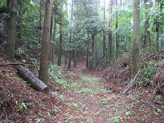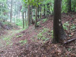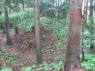 | 南並木城を、「中村新田」の信号の所から遠望した所。かなり目立つ台地であり、眺望もすこぶるよく、城を置くのにふさわしい。この台地の東側をぐるりと回って、車で1郭辺りまで入っていくことも可能である。 | 1郭入口の二重土塁を北東側から見てみた。この土塁の右側が外側の堀。左側が内側の堀で、先が(あ)の虎口となっている。外堀は深さ3m、幅6mほど。内堀はさらに巨大で深さ6m、幅8mほどはある。 この土塁はそのまま東側の2郭部分につながっている。これでは簡単に土塁上に侵入されてしまうので、おそらくかつては外堀が、さらに囲繞していて、土塁と2郭とを分断していたのではないかと想像される。 |