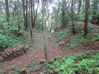 | 1郭東南端の(い)の空堀。1郭の土塁上から南の方を見たところである。空堀の深さは6m、幅は10mほどある。この先は断崖である。 郭内側に土塁の切れがあり、また2郭側にも底に降りていく切り通しの道がある。ここは堀を下って上がる虎口が形成されていたのかもしれない。 また西側に平行して、短い空堀がある。この空堀の北側は西に曲がって延び、南端は竪堀のようになって落ちている。隣に虎口があることから、これと関連した遺構なのかもしれないが、先端が削られているようなのでよく分からない。 |
