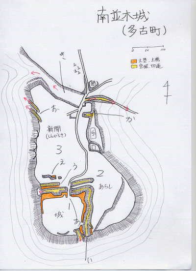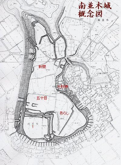 さて、南並木城をざっと見てみた。城としてまとまっているのは、1郭で、ここは二重の堀と土塁で厳重に守られている。ここが城主の居住空間であったと思われる。それに対し、「あらし」「新開」の部分は外郭ともいうべきスペースで、後に拡張されていったものであろう。特に「新開(しんぴらき)」という名称は、城を拡張していったことを示すものである可能性もあると思う。(単に近世に開墾されたと言うだけなのかもしれないが・・・・・)