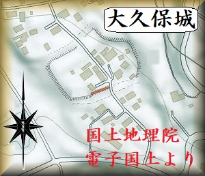 大久保城は、後山の大久保地区にあった。現在大久保15番地の民家の辺りが城址であったという。