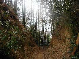 | 南陽院本殿の背後にある堀切。深さ6mほどある。見事である。この左手の裏にはかなり大規模な横堀もある。 | 南側のお堂から、向かい側の1郭を望む。1郭は寺院よりも6mほど高い位置にある。 |