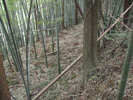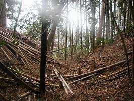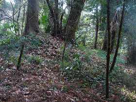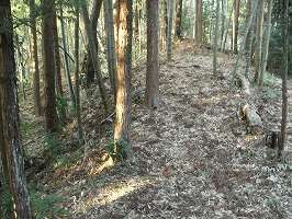 2郭よりも南側にはもはや遺構らしきものはほとんど見られない。しかし東側下の、腰曲輪の形態などから想像すると、この図のように連郭式に2郭、3郭が配置されていた可能性が有ると思われる。この堀跡と思われる所には潅木が直線的に植えられている。これが堀のラインを示しているように思われるのだが、実際にはどうであろうか。