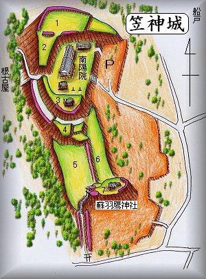 本埜村役場の北東500mほどの所にある南陽院や蘇羽鷹神社が城址である。将監川の氾濫原に近いかつての沼沢地に位置する比高10m余りの島状独立台地に城址はある。城址の西側には根古屋地名が残っており、戦国期にここに城下集落を形成していた様子が伺える。また北東には船戸地名があり、船着場を持ち、印旛沼や利根川の水運に関係していたことも想像される。笠神城の北西1.2kmには小林城、南西1.7kmほどには中根城が存在しており、この辺りは城郭密度が高くなっている。