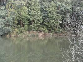 | 1郭東側下の腰曲輪。城塁の高さは3mほど。 | 城の西側下にあるオミネ池。城の水堀であったという伝承がある。 |