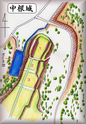 城の西側の下にオミネ池と呼ばれる池がある。地元の伝承ではこれは中根城の水堀であったということである。現状の池は、堀というよりも池そのものであるが、城址の西側下は低湿地であったと思われるので、泥田堀のようなものがあったと見てよいと思う。その一部を利用して、池が造られたものと思われる。