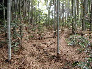 主郭下を取り巻いている横堀。大須賀氏系の城郭にはこうした横堀がよく見られる。ところどころ分断されているが、かつては全周していた可能性もある。