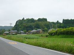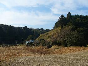 | 5の郭の脇にある堀切13。 | 5の郭のある台地南端部を下から見たところ。左側奥の山が主要部のある尾根である。 |