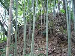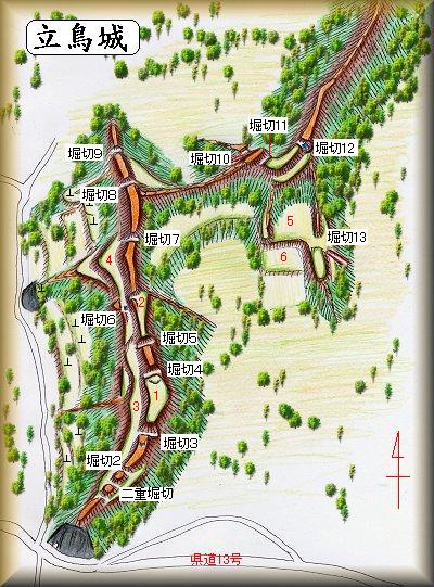 | (以前の記述)立鳥城は宮の台城の1.8km北西にある。南に突きだした比高20mほどの半島状台地で、先端部は県道13号線に面していて一部を削られている。「立鳥」のバス停のすぐ北側の台地である。やはり山林化していて、登り口は分からなかったのだが、城址には空堀や土塁などがよく残っているという。城主等は未詳。 | |