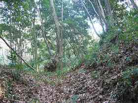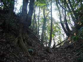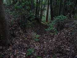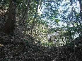 | 2と3の間の、郭が細くなり土橋状になった部分。2郭方向を見たところ。 | 1郭から北東に延びた尾根の先端には深さ6mほどの急峻な堀切がある。 |