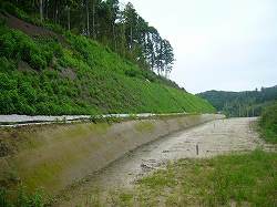 | 1郭虎口を上から見たところ。切り通しの虎口である。 | 城址の西側下はこのような状態で、道路建設のためにかなり削られている。ここに上のラフ図のような鋭い切岸と横堀が存在していた。現在も切岸状の崖は見られるが、工事によるものか、本来のものかは判然としなくなってしまっている。 |