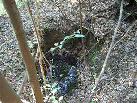 | 堀切8。深さ5mほどある。 | 堀切6のすぐ脇にある方形の窪み。近代のものであろうが、水が溜まって井戸のようになっていた。 |