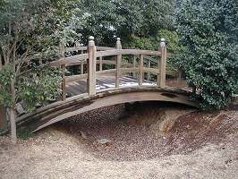 1郭に巡らされていた土塁もほとんどは取り払われているようだが、2郭との間の堀切と土橋だけがかろうじて城の雰囲気を残している程度である。この堀もけっこう埋められており、本来はもっと大きなものであったという。なぜかこの堀切の東側の部分に木橋が架けられている。