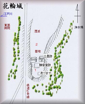花輪城は県道5号線沿いにあり、東葛病院の東側に位置している。すぐ西側には江戸川が流れており、江戸川に臨む段丘上に形成された城であったことが分かる。ざっと鳥瞰図を描いてみようと思ったのだが、城址の大半は削られてしまっており、すでに全体構造は分からなくなってしまっている。そのため図もずいぶんしょぼいものになってしまった。花輪城址公園として整備されているのは南端の長軸30mほどの部分に過ぎず、ここには琵琶首観音堂の跡もある。