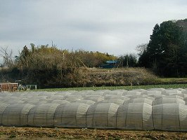 | 3の堀の対岸側。幅100mくらいありそうである。 | 2の堀の切り通しの上の畑にはこのような段がある。(3郭側) これこそが本来の堀のラインの可能性もある。 |