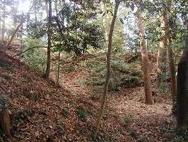 | 1郭南側の虎口を下から見たところ。左側が櫓台の張り出し部分となっている。 | 3の堀跡。左側が3郭であり、堀はかなり大きな谷津となっている。城塁は横矢折れのような形状をしている。 |