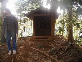 | Aの腰曲輪から見た妙見社脇の土塁。腰曲輪との比高差は2mほどである。 | 西側の土壇の上に祭られている妙見社。千葉一族との関連を示すものである。 |