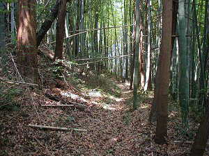 城塁北側(い)の帯曲輪、幅は1m〜3mほどで、まさに帯という感じ。右下は台地下までの土手であるが、削り方は戦国城郭に比べてやや甘い感じがする。