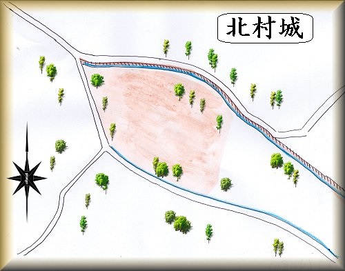 方100mほどの郭で、周囲には幅10mほどの堀が取り巻いていた。この堀は、他の居館と同様、明治以降の耕地整理でかなり埋められてしまったと言うことであるが、水こそないが現在でもくっきりとその跡を認めることはできる。上の図は旧状を想像して描いてみたものである。