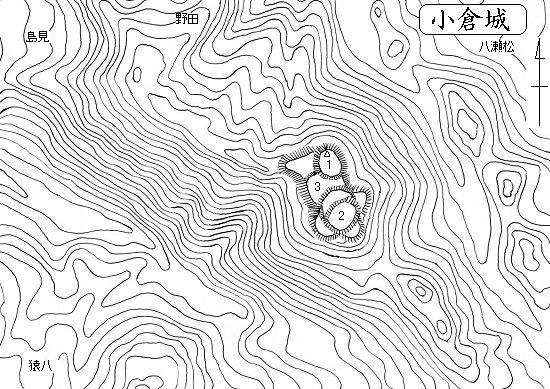 小倉城は標高434mの独立峰の山稜上にあった。周囲は急峻な崖で、特に西側は切り立った岩場が渓流に落ち込んでいる。国土地理院の三角点がある山頂を中心にいくつかの郭が展開しているが、各郭は小さく、あまり多くの兵を収容できたとは思えない。昔(中学校の頃だが)4月の末に登ったら、まだ根雪が残っていたのに驚いた記憶がある。山頂へ登る道は現在では全くなく、下からよじ登って行くしかない。