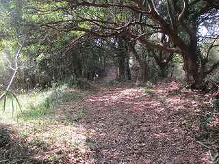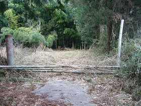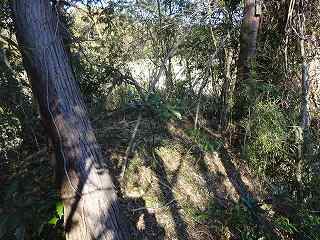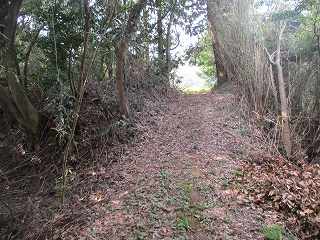 | 台地南側にある作業小屋。この右手辺りから城内まで通じる道が付けられている。 | 台地基部のネック部にある堀切。ここから先が城内ということになる。 |