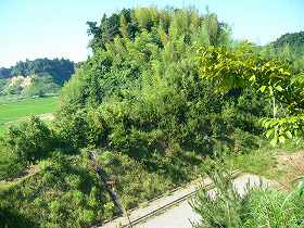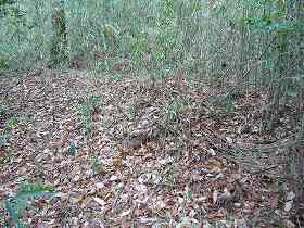 | 先端の「危険 立ち入り禁止」となっている部分。ぱっと見たところ、特に危険なものがありそうには見えない。 | 台地中ほどにある方形の土塁の一部。かなり崩されているのか、現状では高さは1m程度である。堀もほとんど埋められている。 |
